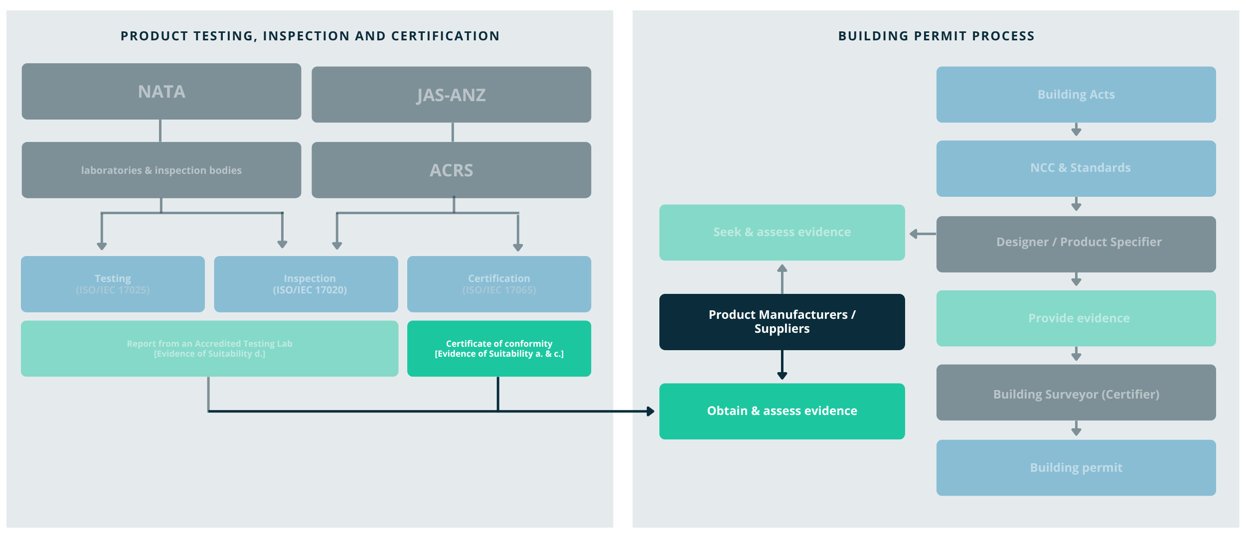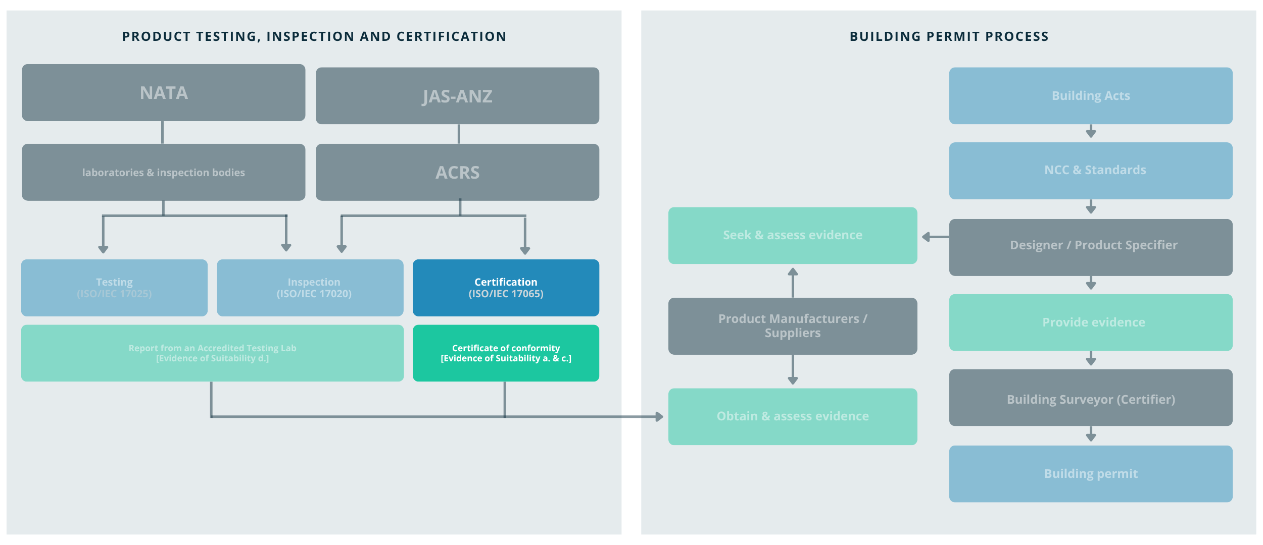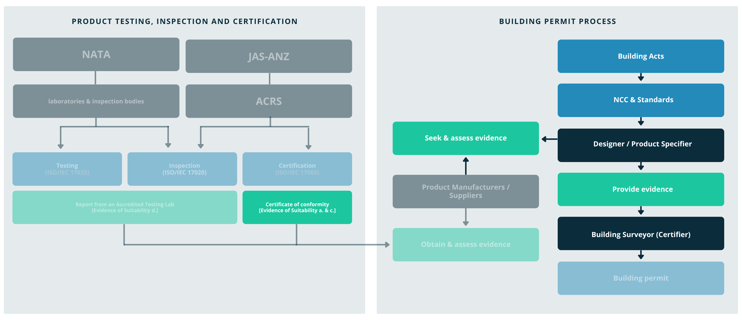For designers or product specifiers, under the Building Acts they must seek and assess evidence of compliance with the National Construction Code for relevant products used. A certificate from a recognised authority like ACRS provides both evidence and validation. This in turn can be provided to a certifier as part of securing a building permit: